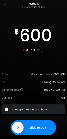Fatto, il pagamento è istantaneo. L’app converte automaticamente i dollari del tuo saldo disponibile in baht thailandesi al tasso di cambio mid-market (quello che vedi su Google), e il commerciante riceve i suoi soldi all’istante.